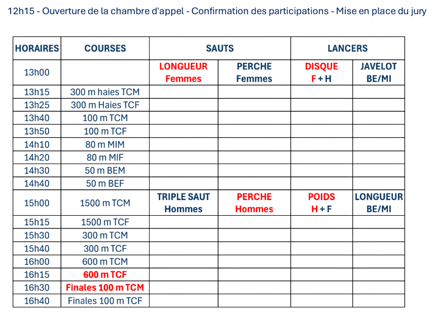 - 50m (BE), 80 m (MI), Longueur (BE/MI), Javelot (BE/MI).